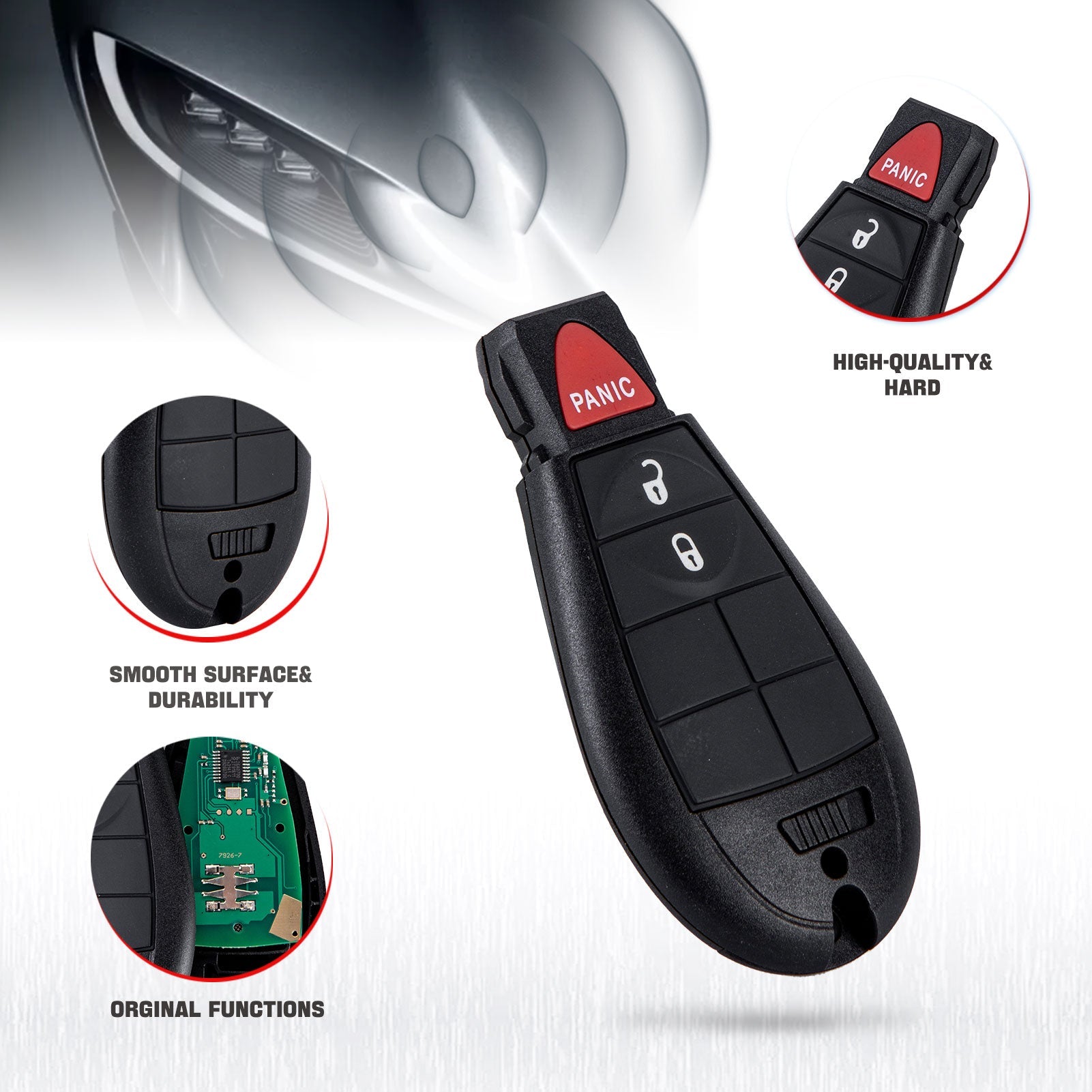 The remote feature of this key fob will increase your and your car’s safety, with the remote locking and unlocking making it easy to get into your car quickly in unfamiliar, threatening settings. The remote safety feature of the alarm button is also a valuable tool, which can be used to deter potential thieves or vandals that loiter around your vehicle.